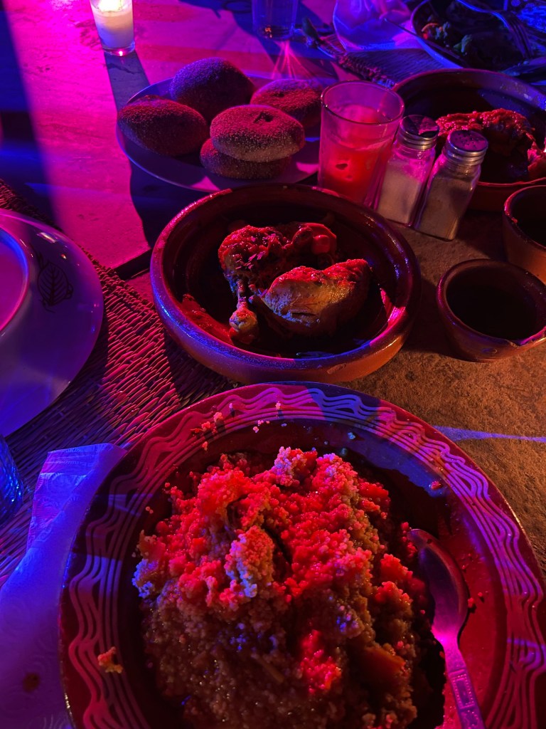 As the day wound down, we were treated to a delightful dinner under the stars. The meal began with a traditional Moroccan soup accompanied by freshly baked, homemade bread. For the main course, we enjoyed a hearty serving of couscous with roasted vegetables and chicken. While the food was good, it didn’t stand out as anything extraordinary—but the setting more than made up for it.